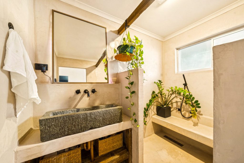 – Statement bathroom with large stone basin, shower with built-in bench seat, and separate toilet