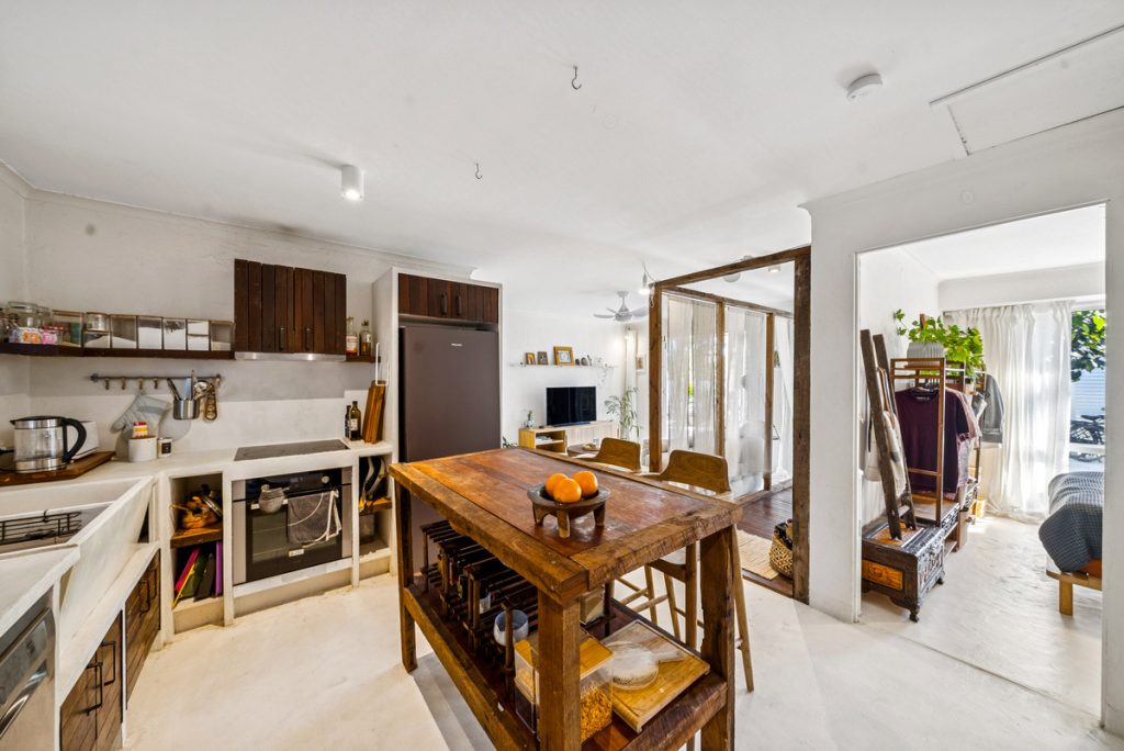 – Functional kitchen with deep stone sink and open shelving