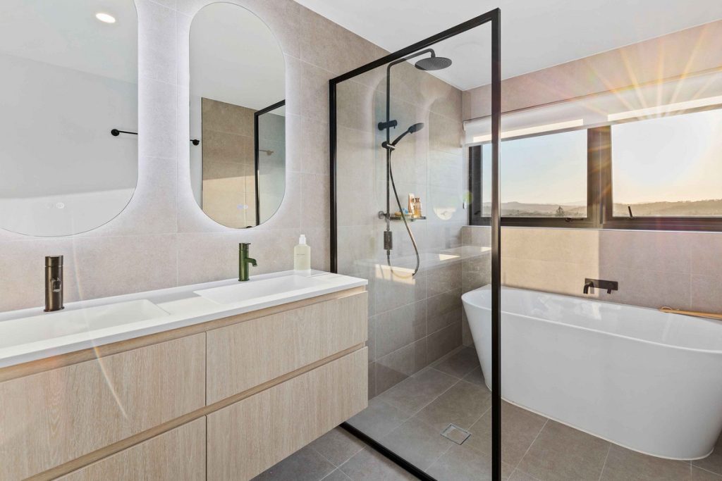 The master suite offers a tranquil retreat with floor-to-ceiling windows framing hinterland scenery, a walk-through robe, and a sophisticated ensuite with double vanities, freestanding bath, and walk-in shower. Two additional bedrooms, each with built-in robes, share a stylish main bathroom with modern finishes.