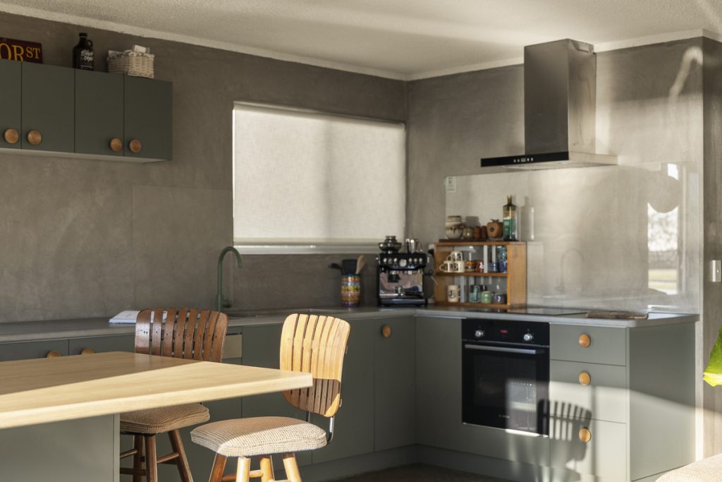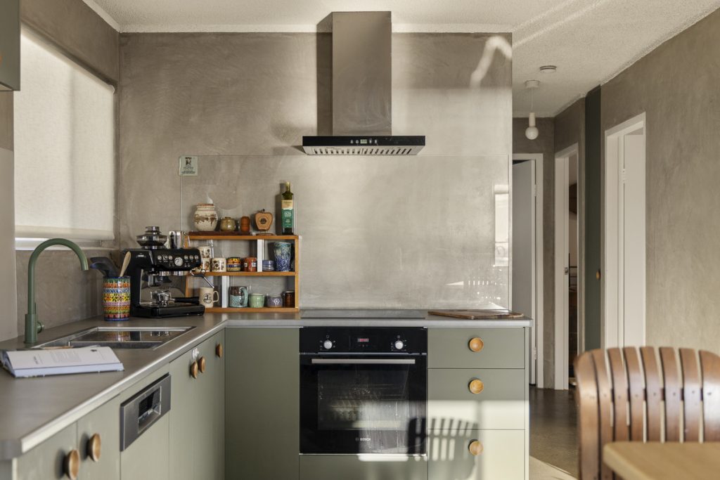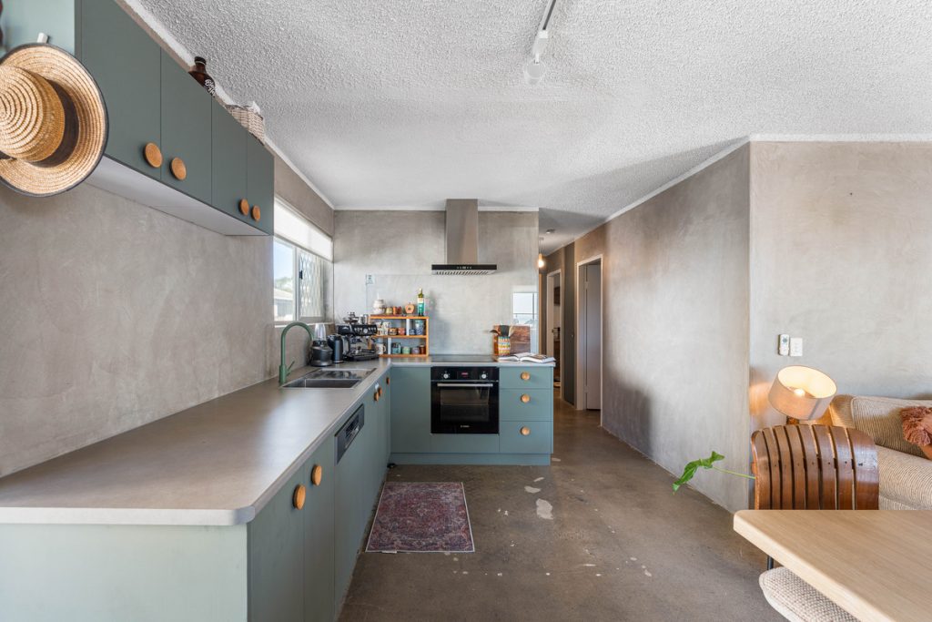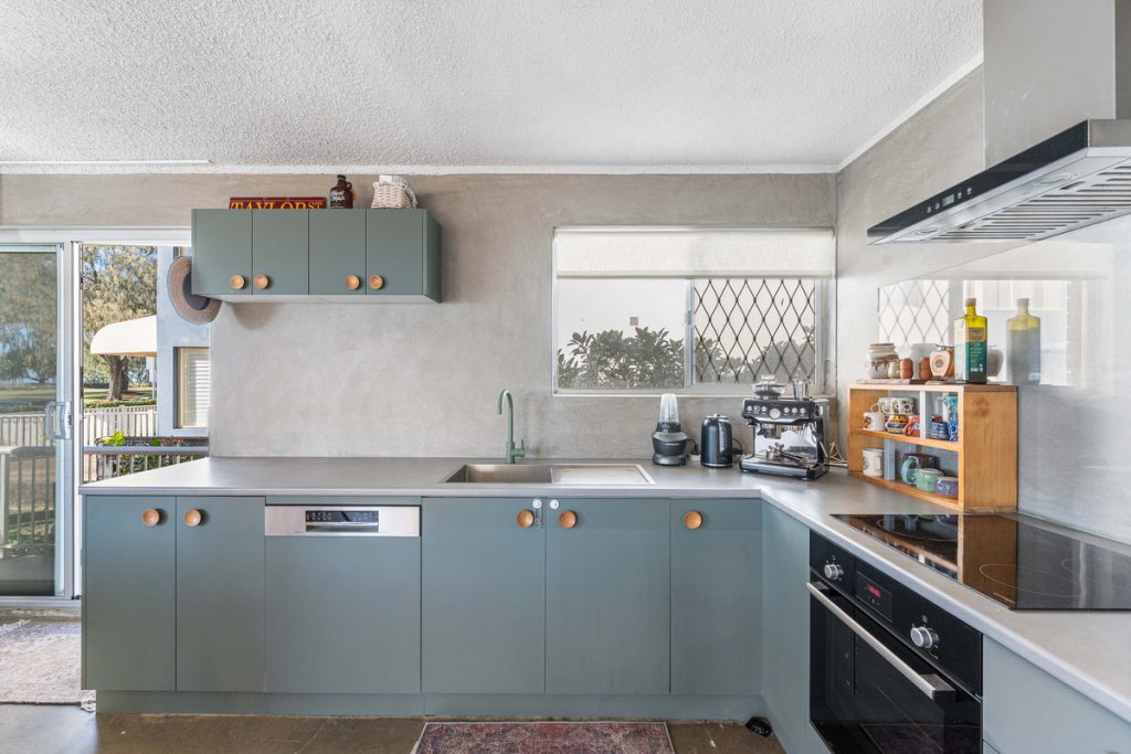 The kitchen exudes timeless coastal elegance, featuring mid-century-inspired cabinetry, a breakfast bar, and quality modern appliances. Two serene bedrooms with built-in wardrobes and ceiling fans provide restful retreats, complemented by a versatile third room ideal for a study, nursery, or creative space.