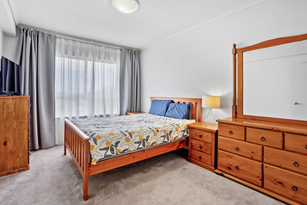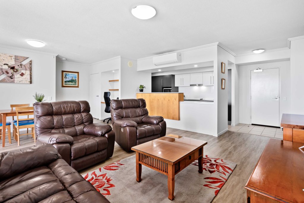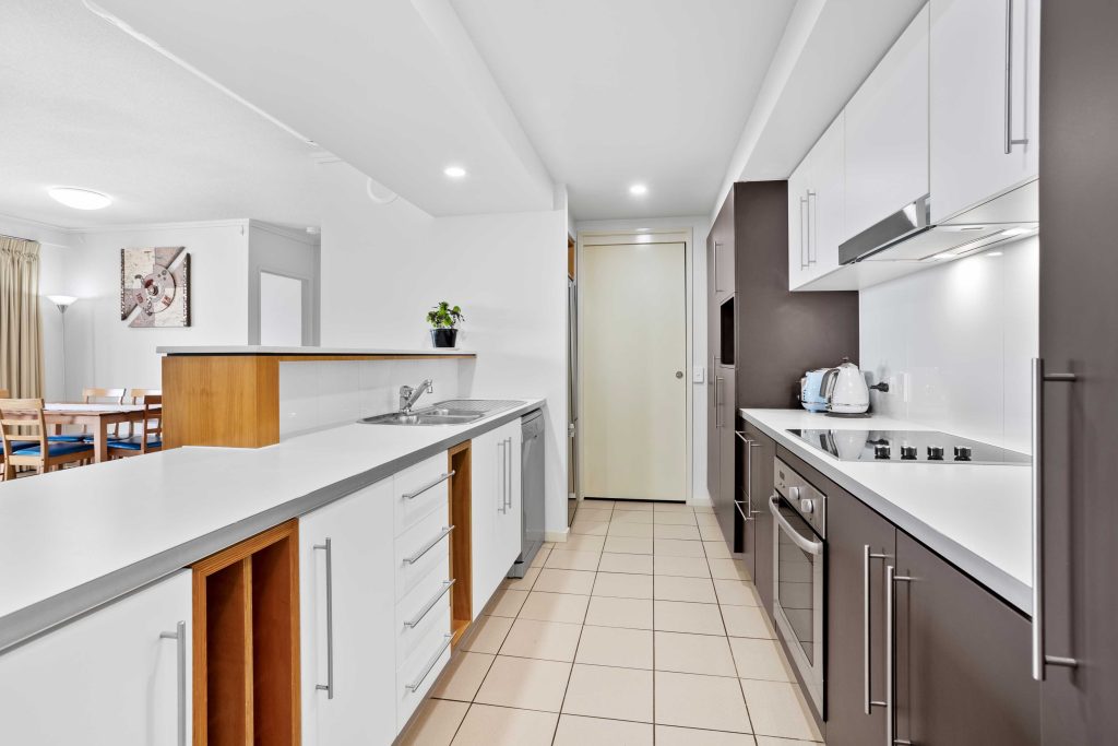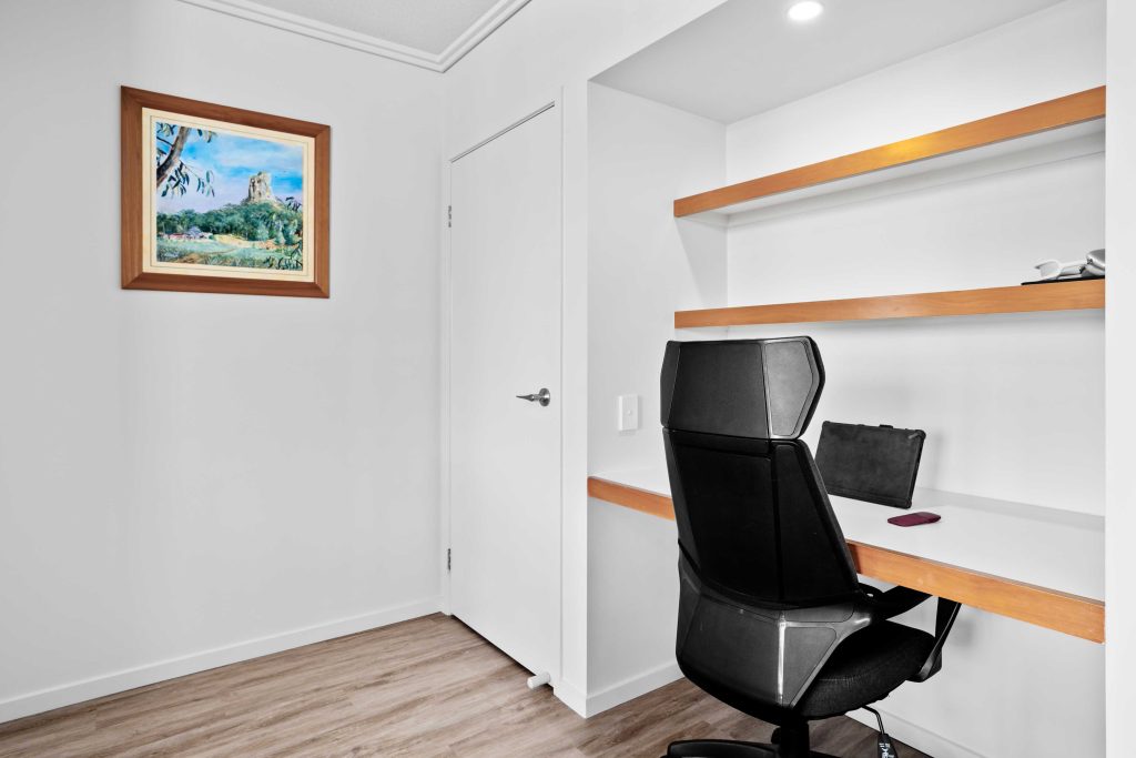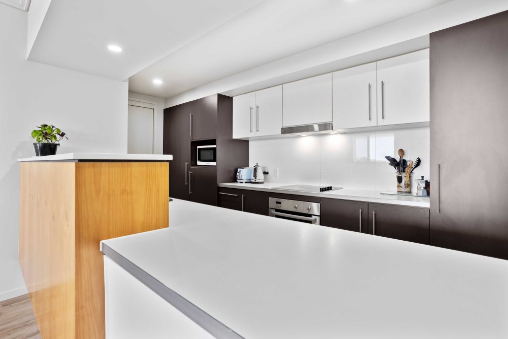 Open plan in design, the spacious living area opens onto a huge undercover entertaining balcony enjoying peaceful views of the skyline. The stylish kitchen features a large island bench with a stone benchtop, and stainless-steel appliances including a dishwasher.